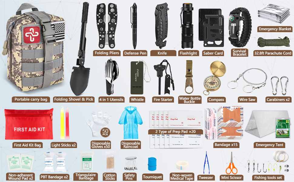 238 पीसी आपातकालीन जीवन रक्षा किट और प्राथमिक चिकित्सा किट पैदल यात्रियों, शिविरार्थियों, बचाव दलों और अप्रत्याशित बाहरी आपात स्थितियों की तैयारी करने वाले किसी भी व्यक्ति के लिए बनाई गई है। टिकाऊ, मौसम प्रतिरोधी सामग्री और पेशेवर-ग्रेड का उपयोग करना घटक, यहकिट जीवित रहने, नेविगेशन, प्राथमिक चिकित्सा और आपातकालीन सिग्नलिंग के लिए आवश्यक उपकरण प्रदान करती है।