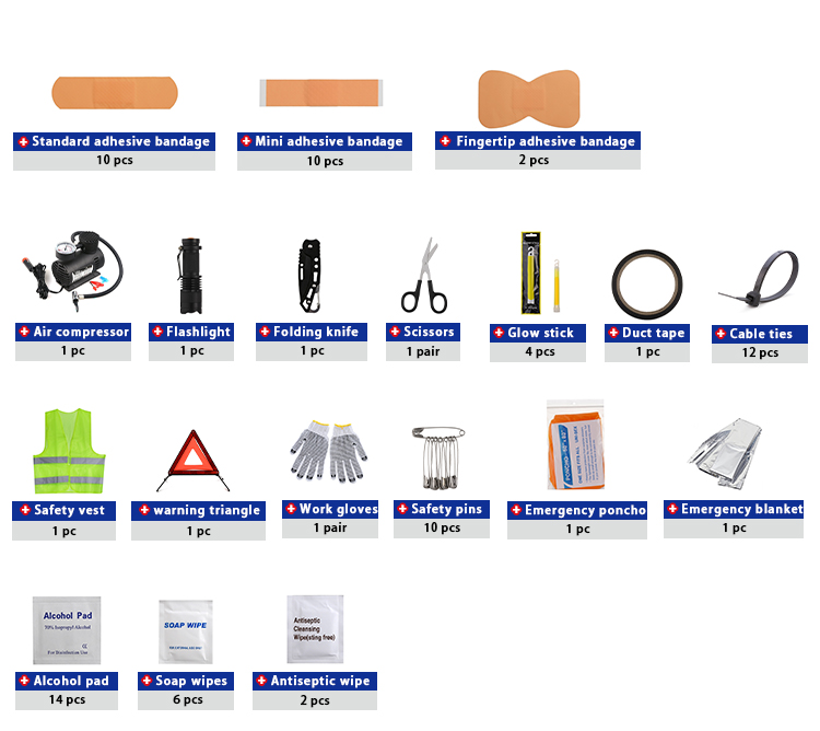इसमें बैंड-एड्स, कीटाणुशोधन कपास की गेंदें, पट्टियाँ, कैंची, संदंश, आदि शामिल हैं। ये आइटम सड़क पर होने वाले मामूली कटौती और घर्षणों को संभाल सकते हैं।